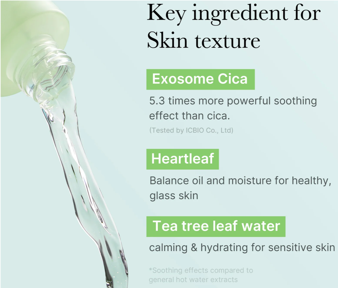 Η προηγμένη του σύνθεση περιέχει Exosome CICA σε νανομέγεθος, έως και 1/510 μικρότερο από τους πόρους, προσφέροντας 5,3 φορές πιο ισχυρή καταπραϋντική και εξομαλυντική δράση σε σύγκριση με την κλασική cica. Βοηθά στην άμεση ανακούφιση του στρεσαρισμένου δέρματος, στη βελτίωση της υφής και στη δημιουργία glass-skin όψης, χωρίς κολλώδη αίσθηση.